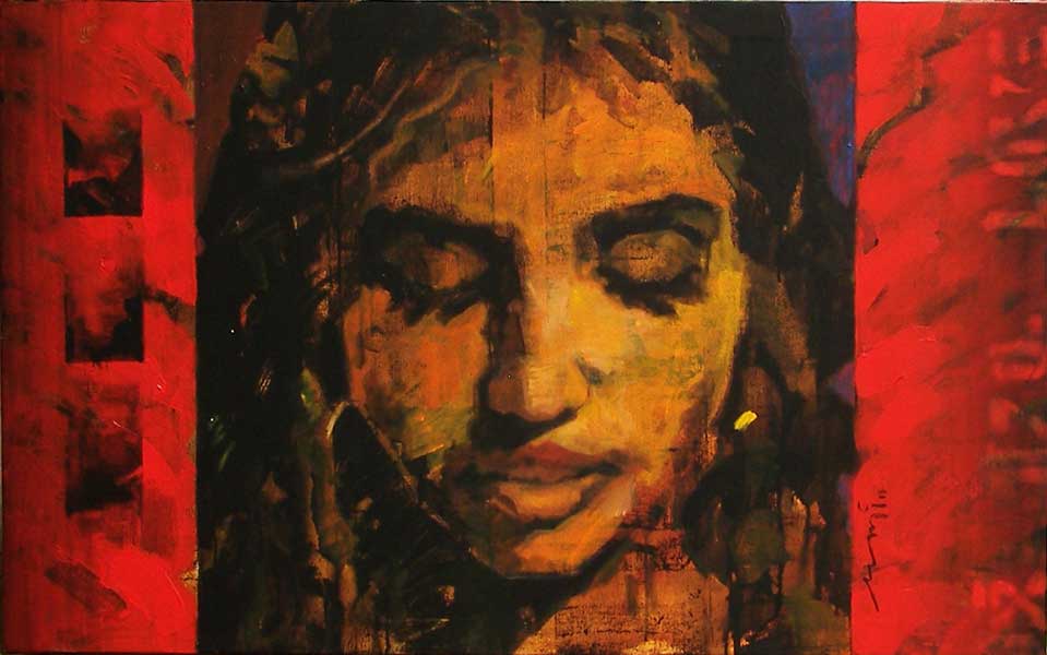 The various characters in my work have been displayed with partly closed eyes with subdued vision and aptly demonstrate the thinking/thoughtful oneself engaged in search of self identity of genre in the relevant arenas. It involves totally intermingling human sentiments like emotional attachments and ties of close knit relation. Hence, psychological involvement, love, joy, passion, peace, eternity, almighty and other related forms always find due place in my work so as to decorate it with vivid forms of sentimental mindscapes of any sensitive human being.